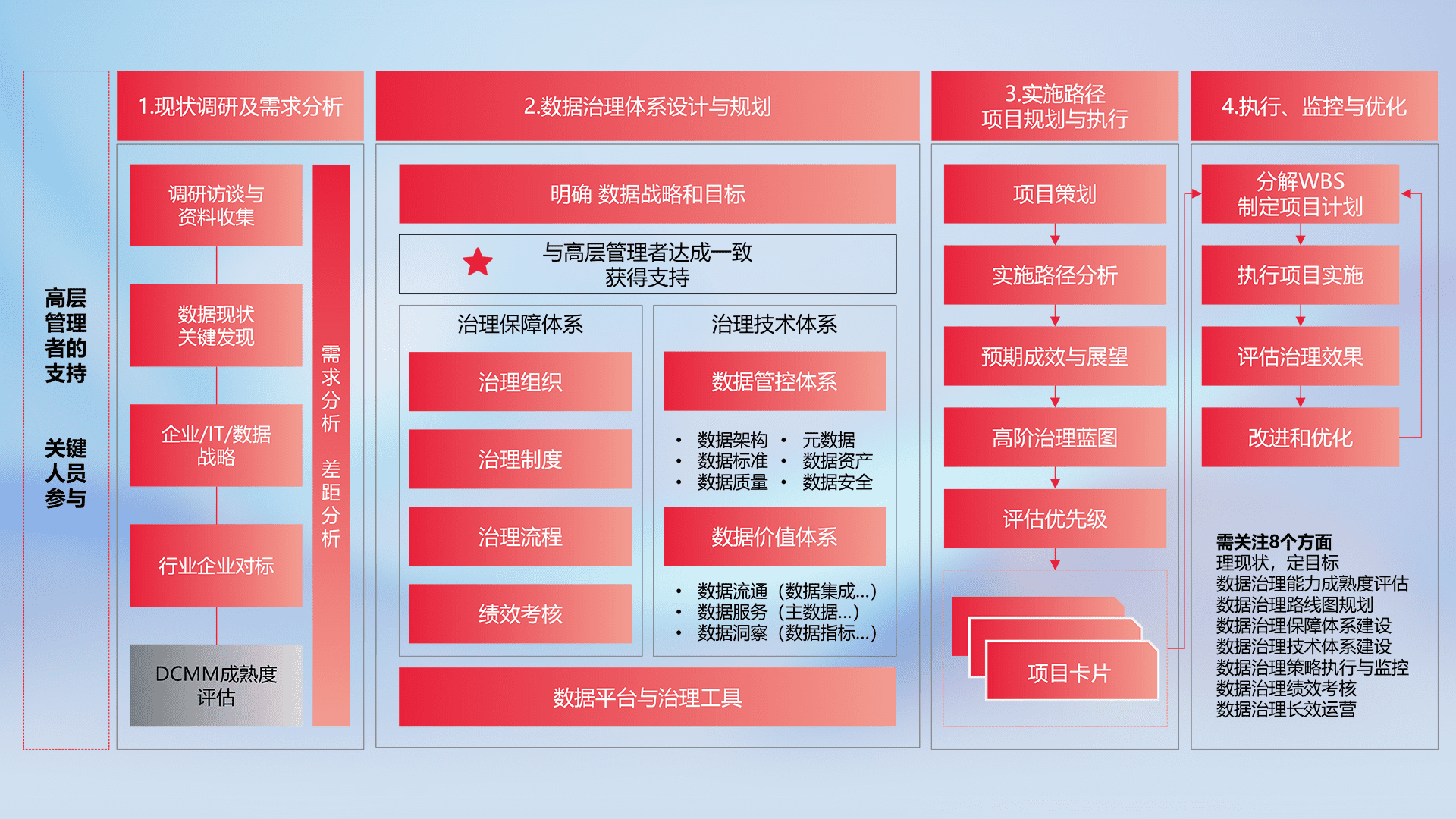 制定并执行统一的数据标准,,,规范数据定义和格式,,,消除冗余和不一致性,,,,实现跨部门和跨系统的数据一致性,,,为企业提供标准化的数据基础。。